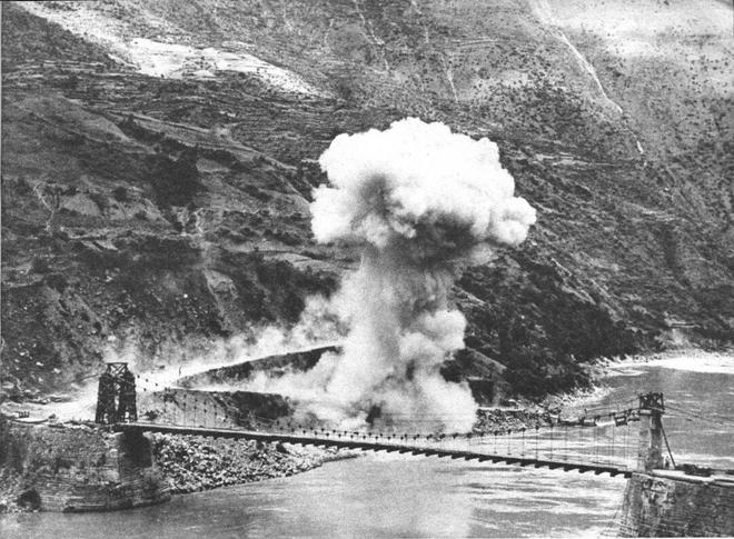 需要说明的是,滇缅公路修好后,并没能持续不断地向国内运输物资。为了安抚日本,英国曾被迫关闭滇缅公路三个月。此外,滇缅路上澜沧江功果桥、怒江惠通桥等重要枢纽被日寇飞机一次次轰炸,我方只能一边抢修桥梁,一边抢运物资。1942年5月5日,中国军队不得不炸毁惠通桥,切断了滇缅公路,以阻日寇东进。在《西征记》中,对此亦有大段描写,我在《老兵不死》一文中引过,不妨再引相邻的两段,这里不单有摧毁的桥,更有摧毁的心: